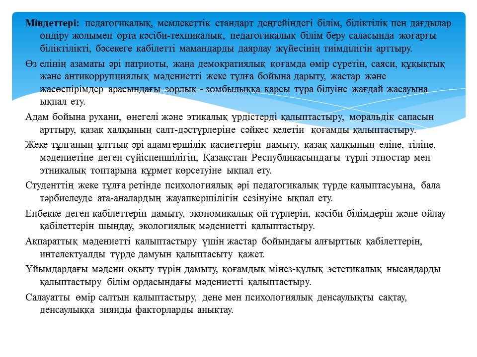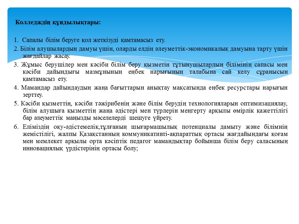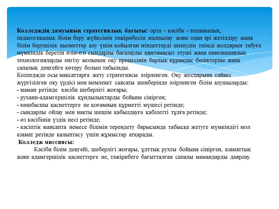 Колледж миссиясы • Кәсіби білім деңгейі, шеберлігі жоғары, ұлттық рухты бойына сіңірген, азаматтық және адамгершілік қасиеттерге ие, тәжірибеге бағытталған сапалы мамандарды даярлау.